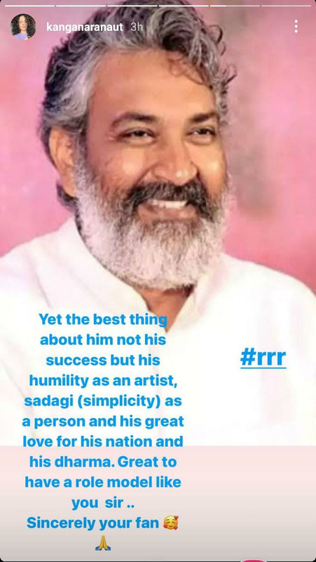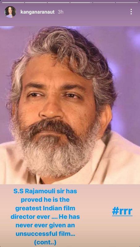 डायरेक्टर एस एस राजामौली की तस्वीर को अपने इंस्टाग्राम स्टोरी पर लगाकर एक्ट्रेस कंगना रनौत ने जमकर उनकी तारीफ की है। उनके तारीफ करते हुए एक्ट्रेस कंगना ने लिखा कि डायरेक्टर राजामौली सर ने साबित कर दिया है कि वह अब तक के सबसे महान भारतीय फिल्म निर्देशक है। उन्होंने कभी असफल फिल्में नहीं दी है।