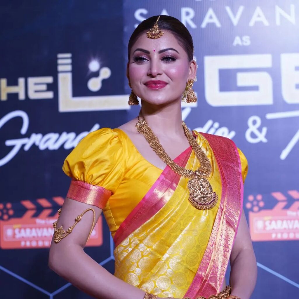 उर्वशी (Urvashi Rautela) ने अपने पारंपरिक कपड़ों में तमिलनाडु की समृद्ध संस्कृति को चुना, जो इस दक्षिण भारतीय राज्य के सांस्कृतिक सार का प्रतीक है। उन्होंने जातीय तमिल पारंपरिक साड़ियों का विकल्प चुना जहां अभिनेत्री खूबसूरत लग रही थी। उसने एक शुद्ध रेशम कांजीवरम, पीले रंग की साड़ी और एक गुब्बारे की आस्तीन का ब्लाउज पहना था। और उस परंपरा को बनाए रखते हुए, उन्होंने एक बहुत ही भारी लंबे कुंदन नेकपीस के साथ एक परफेक्ट गोल्डन मांग टिक्का और झुमके, नागम और चूड़ियों का विकल्प चुना। उर्वशी ने अपनी एक्सेसरीज़ को एक कमर पट्टा के साथ पहना जो उनके पहनावे के साथ पूरी तरह से खिल रहा था| उस आकर्षण को जीवित रखने के लिए, उसने अपने बालों को एक बन में बांध लिया और उसे सफेद गज्जरों से ढक दिया, जिससे वह किसी सुंदरता की देवी से कम नहीं लग रही थी। मेकअप की बात करें तो उन्होंने इसे न्यूड लिप शेड के साथ बहुत ही मिनिमल रखा क्युकी अभिनेत्री ने अपने पोषक को खिलने दिया|